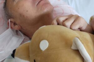 朝帰りネコ、おいでといわれていっしょにベッドへ。お土産のおにぎりはシャワー浴びてる間にいただきまして。